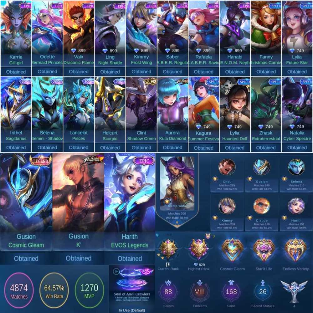 Mythic Glory 829pts Gusion Legend Kof Epic Recall Soa High Wr 64